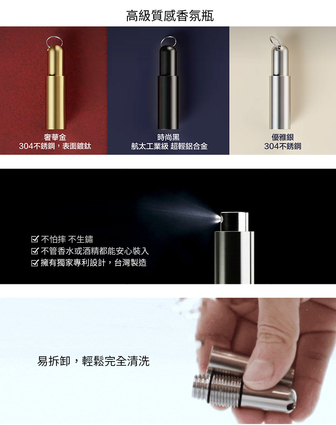 瓶身可拆洗更換液體,適用香水、精油、酒精、化妝水等。